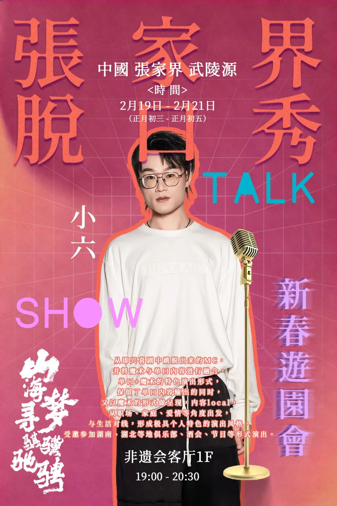 峰林为幕,似一幅雄浑壮阔的画卷徐徐展开;溪水作弦,弹奏出灵动悦耳的欢乐乐章。2026年2月19日-21日,正月初三至初五,每晚19:00-20:30,张家界武陵源索溪河畔「非遗会客厅」,将化身欢乐的海洋,开启一场长达90分钟、全程无尿点的脱口秀盛宴!这可不是简单的笑声剧场平移,而是山海之间首次“张脱”狂欢,注定成为这个春节最耀眼的娱乐焦点!