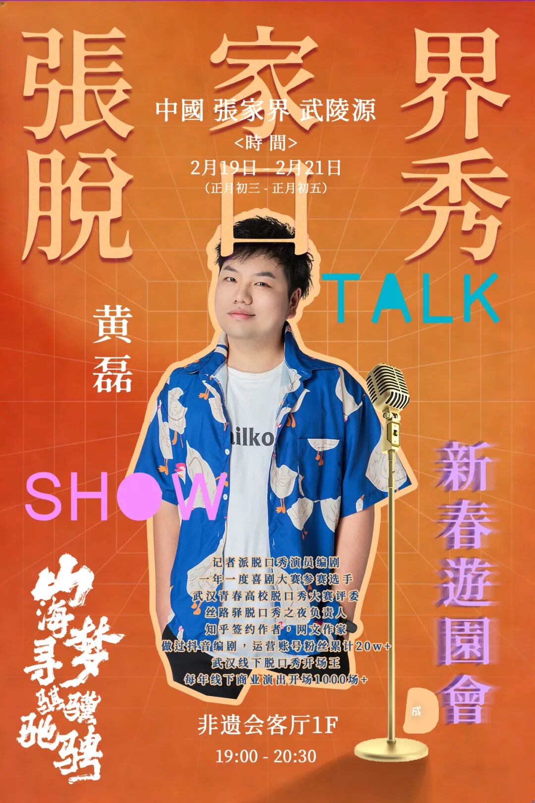 黄磊,武汉线下脱口秀开场王,抖音编剧、丝路驿脱口秀之夜负责人、知乎签约作者、网文作家、喜剧大赛选手、幕后执笔人,更是台前炸场王!他的段子,就像一把把利刃,直戳抖音用户的心窝,让人刷到根本停不下来;他的开场,宛如一阵狂风,瞬间吹散台下的矜持,让观众们拍红手掌仍觉不过瘾!这一次,他带着满满的江湖经验,强势登陆张家界,誓要让这片山水都沉浸在他的幽默风暴之中!